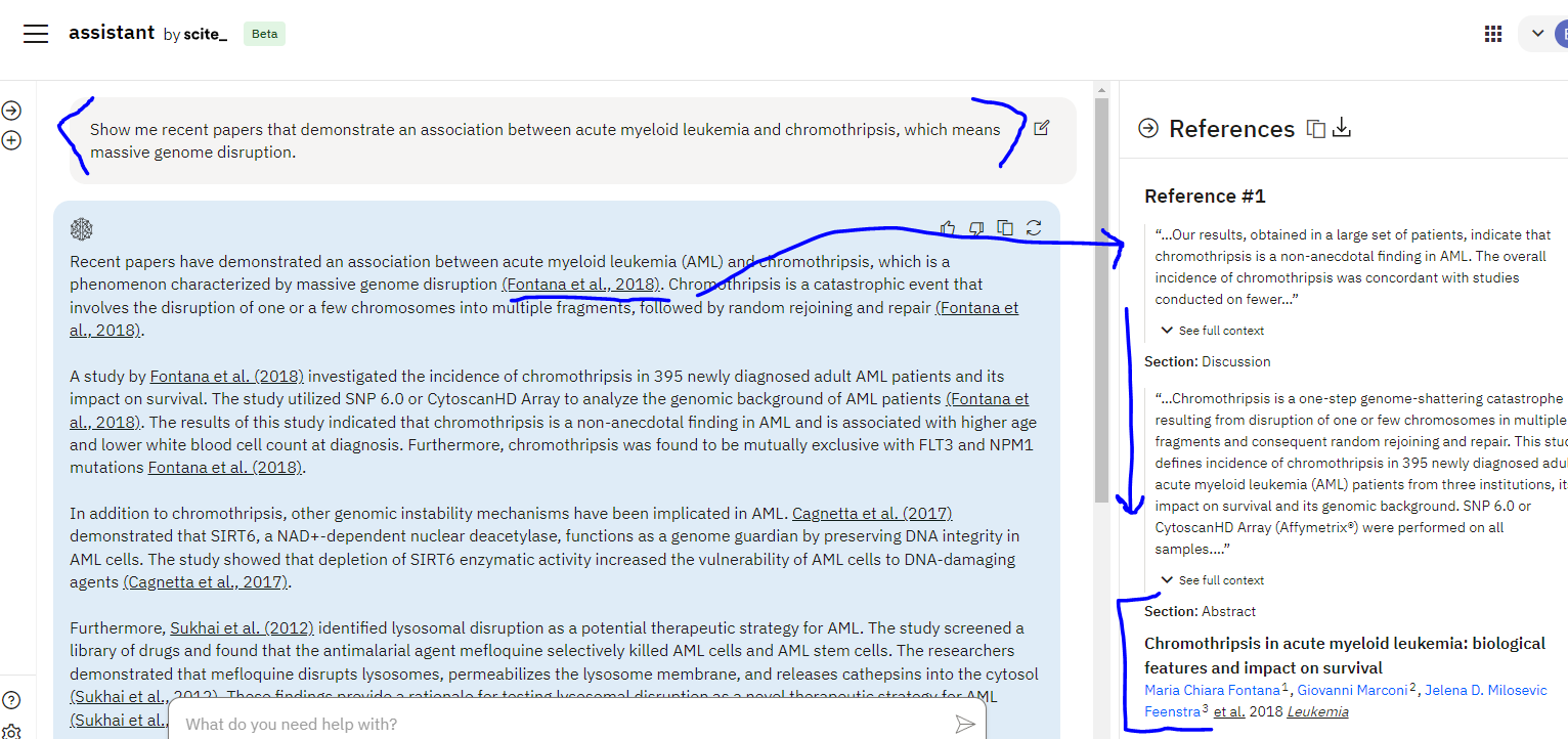 SCITE also includes a tailored AI service geared to citations. It can produce a dozen or more citations in response to tailored question. Unlike PubMed, it can provide these in an "essay" like format, with citations hotlinked in short sections of text that explain what that paper provides. Meanwhile, in a right-hand side bar, you can see roughly 50-word extracts from that paper (assuming full text is online), then a hotlink to the full reference of the paper. This right-hand column marches down the screen with paper by paper detailed data, matching each citations hot-linked in the "essay" response.